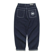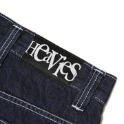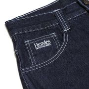 Designed with a high waist and classic 5-pocket layout, they feature reinforced stitching around the crotch area for extra durability, double-stitched leg cuffs to keep everything solid, and premium Heavies detailing throughout—woven labels, an embroidered logo on the change pocket, plus a custom Heavies button and metal zip fly.