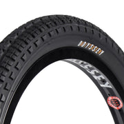 The Odyssey Aitken Knobby Tire, designed with BMX legend Mike Aitken, features aggressive knobby tread for dirt trails and a fast-rolling center for versatility on street and park.