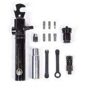 The Shadow Multi-Tool is a durable and versatile steel tool with investment casting, forging, and CNC construction. It includes a variety of essential tools for daily riding needs such as chain breaker, socket, wrenches, spoke wrench, tire levers, and more. With a weight of 33.6 ounces, this compact tool is ideal for carrying in a backpack and avoiding unexpected mishaps. Don't leave home without it.