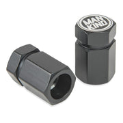 Alloy valve caps with a hexagonal shape and Mankind laser logo, fitting all Schrader valves. Perfect for customizing your BMX bike.