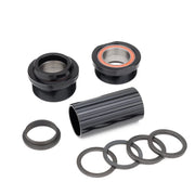 This Euro bottom bracket uses threaded aluminum bearing cups with four sealed cartridge bearings for smooth, durable performance. It includes a center tube spacer and multiple adjustment washers to help you dial in chainline and spacing for your setup.