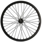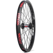 The Stranger Crux V2 XL Front Wheel is built using a 36H Stranger Crux XL double-wall rim, laced 3X with straight-gauge 14G spokes and brass nipples to a sealed Stranger Crux V2 front hub. The hub features a low-flange aluminum shell with sealed bearings, a 15 mm chromoly center axle, alloy press-fit cones, and removable nylon hubguards to protect the hub flanges and spokes from grind damage.